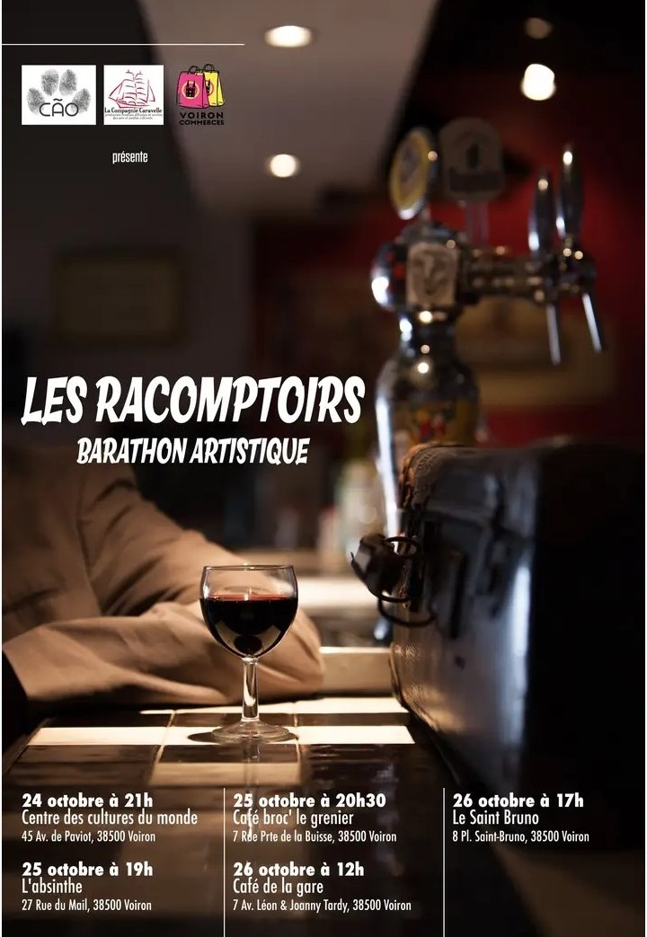 Les Racomptoirs tracent leur route. Après Annecy, des 3 au 5 octobre derniers, qui a vu défiler une équipe d’artistes conduite par Antoine Guillot et Camille Dégeorges Ruffelaere dans cette ambiance toujours très conviviale où Laure Poltex a fait entendre son orgue de barbarie, c’est à Voiron que se déroule la nouvelle édition de ce barathon artistique. Alexis Campos, propose pour cette nouvelle rencontre ses « cabarets éphémères » avec une dizaine d’artistes qui vont l’espace d’une heure proposer chant, danse, musique et marionnette dans différents commerces et établissements voironnais. Les Racomptoirs du 24 au 26 octobre. Le 24 octobre à 21h au Centre des Cultures du monde/ le 25 octobre à 19h à L’Absinthe et à 20h30 au Café Broc’ le grenier / Le 26 octobre à 12h au Café de la Gare et à 17h au Saint Bruno. Et toujours en partenariat avec La Compagnie Caravelle. Merci aux Racomptoirs et à ces moments inattendus et toujours surprenants.
